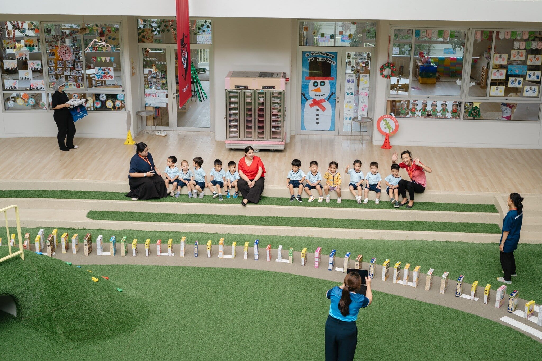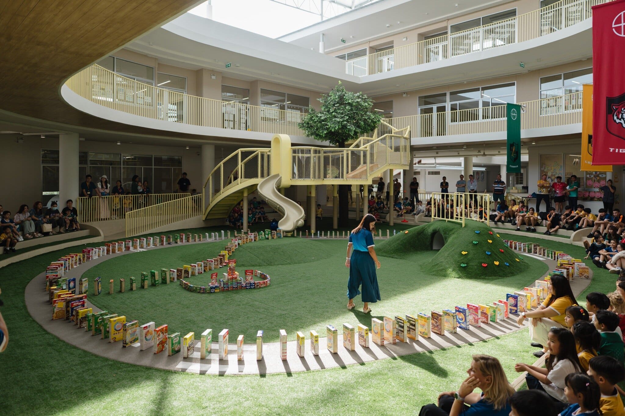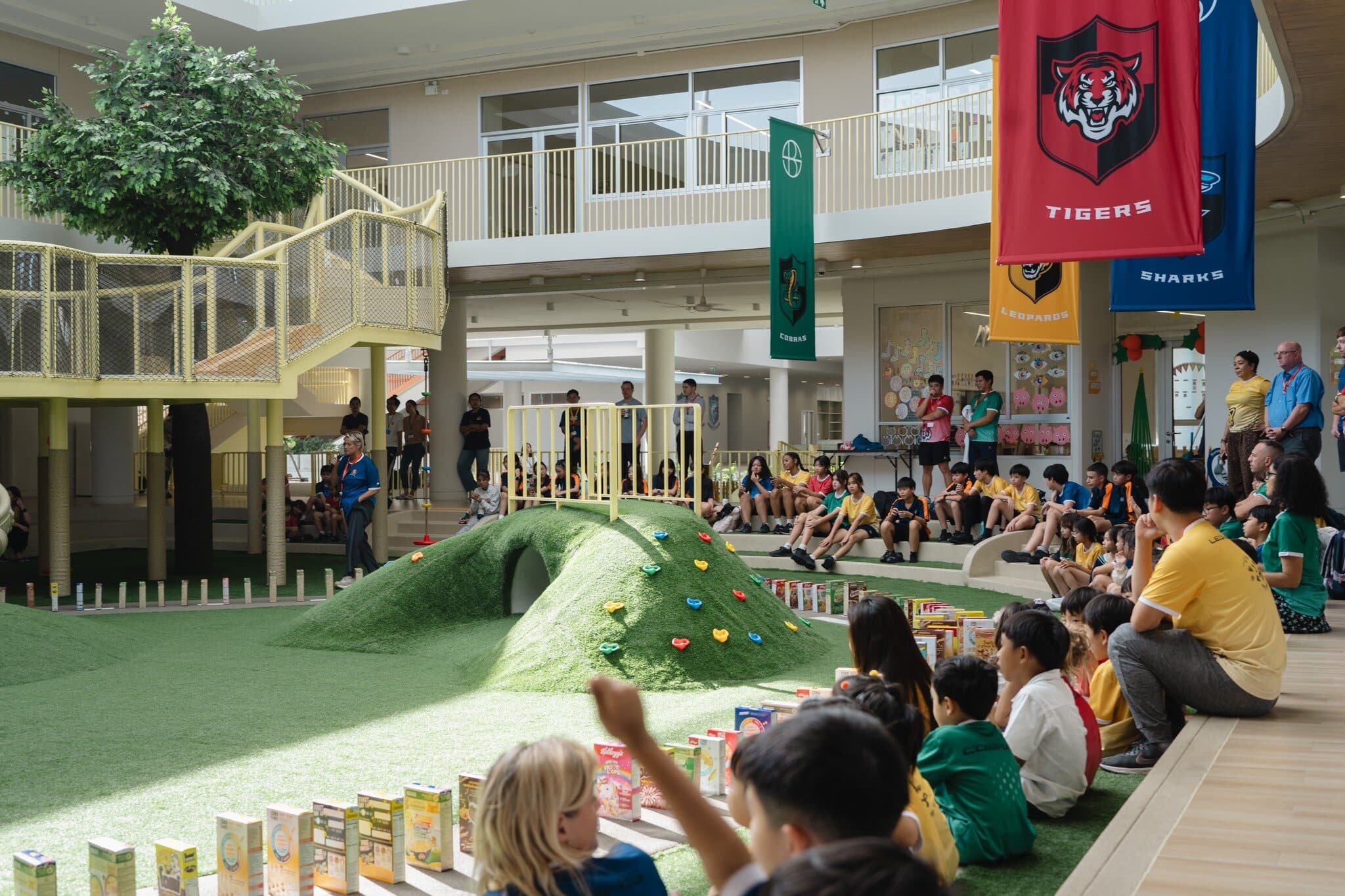 Mrs Crossland (EY & Primary Principal) organised a captivating House Competition culminating in the “great cereal box topple.” Our school cheered on Ms Dimple (Staff House Leader – Blue Sharks) as she deliberately toppled the first cereal box at the foot of the Early Years slide. The ripple of kindness spread quickly across the playground.